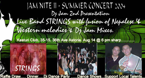 This should indeed be a fun night. Strings band consists of really hardworking and young raw talents. With small gigs here and there, they have created their own long list of fans in NY. This would be a great opportunity for them to come out as a feature act and prove to us if they are for real when it comes to rocking the event. Not just as a warm up act but as the main act. So, good luck guys - Karma, Pasang, Pawan, Raju and Tashi. Jambu and Michael has been in the NY scene for many years now. With their collections of hardwares to thousands of songs, they have proven themselves to be the top notch Nepali DJs in NY area. Let's find out on our own how these people will rock the night and, as their ad promises, "a party like you've never attended." We'll see!