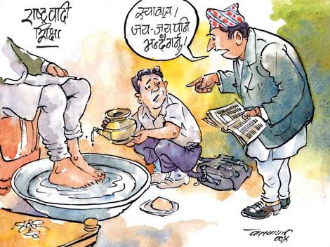 This is NOT his fault BUT our system's fault. Unless we root out Feudal Royal system by burning into ashes, a complete awareness level to all citizens can not be achieved. There will always be some people, who unknowingly behave like Shiva Shrestha. However, such acts from Shiva Shresta--- a popular and successful movie star--- are very very shameful. It was better for him to drawn in a cup of water than to touch an drug-smuggler's legs. I wonder what he is thinking while doing such silly act. This was what Gurga Baral depicted in his cartoon about Rastrabadi Shiksya. --- OK