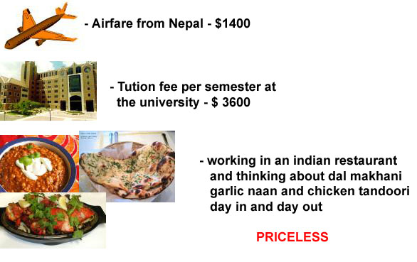 Pricless ji - tapai sarai funny hunodo raichha. La arko euta hai: Weekly Salary (in cash) :$300 Tips (when we can keep them) : $ 400 Seeing Gyanendra chicken out and his supporters give wimpy excuses: Priceless There are some cuisines we don't serve, for everything else there is Maharaja InterContinental restaurant.