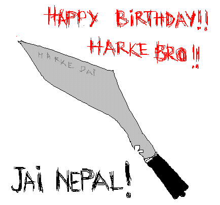 Wow! the Birthday party doesn't seem to come a hault...:D...All these B'day party's been wonderful....Hope HarkeDai's AKA (Hos nabhanum hola marcha pheri harkeDaile..:P) Birthday will be wonderful as well.....Best Wishes for Harke on his day...aba time to cut the cake hai harke....Blow out the candle and make a wish..ani whatever you wished for, hopefully will be fulfilled..:)....Hey guys come and join for the Birthday cake..:D Cheers for a B'day boy!...:D:D:D P.s: sabai kasto creative.....Anonko khukuri kasto ramro and ruina's mobile message too..:D....mero ta kehi chiana..test cha aja..ani yeso hereko ta harkeko b'day..wish garhalum bhanera aako.....:) Later.