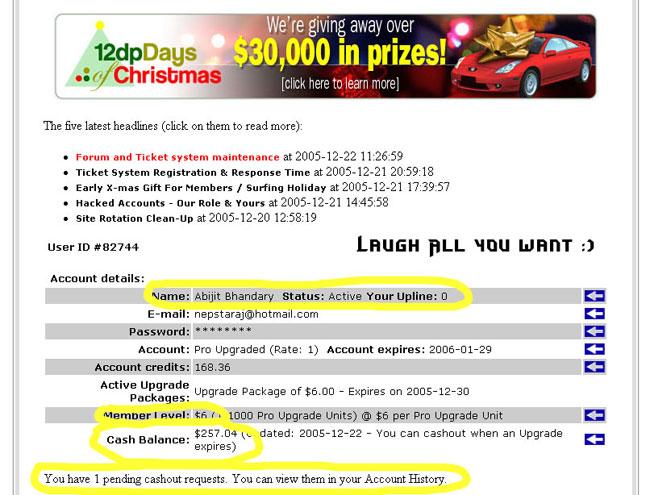 Ha ha ha very funny replies. Am I saying that you 'should' invest...NO! Refer garyo bhane we get about 12% of your upgrades that's all. We came here with good heart...to help people..has any of you even searched for it in google before bashing both of us? Google on '12 daily pro scam' or go to the website's forum and look for it yourself. I will be interested to see what you will find and please don't forget to post your result here. Aaba ahile samma paisa tirirako cha bhanera, future ma tircha bhanne kehi gurantee chaina! Just play safe and milk the cow when it's milking bhanna khojeko matrai ho. But this is fact 'NO ONE HAS EVER BEEN UNPAID WITH THIS PROGRAM YET' They have 200, 000 members so far. Jai Hos! Revival
