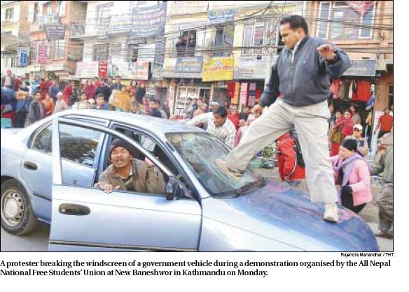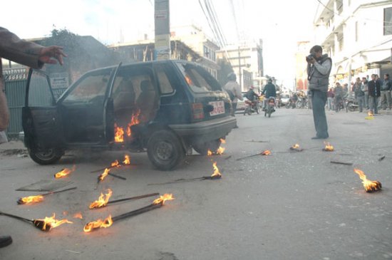 Look at kantipur news of today, it has complete video of this act... these bandars destroy it then, flip over the car.. they also tried to destroy another car but the other driver sped away faster than they could react.... Sale pashupati ka bandar haru... they do not know difference between vandalism and protest.. Check nepali news it is somewhere around 20 minutes point. - http://kantipuronline.com/ktv_news.php