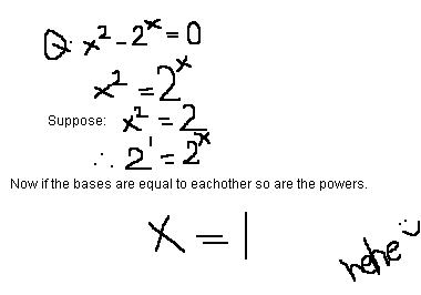 can anyone solve: x^2 - 2^x =0 by algebraic method??? (x squared minus two to the power x equals zero) of course, without using graphing calculator.
