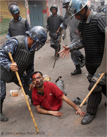 Thanks Symlyn and Katziman. Its so sad to see excesive use of force on those protestors. Yestai karan le garda yi sale dhide haru lai maobadi le thokda pani maya lagdai na. Kina bhane yiniharule payen bhane tyasai garera thokchan, kuterai marchan ta. I will be happy the day I see picture of Kamal Thapa and other Gyane's chamcha getting beaten by people in same way. I was reading about the press coference he had in KTM today. Was shocked and angry at his comments, those comments sound like from a retard nazi. "we will use more force to implement real curfew". I do not know what "more force" and "real curfew" mean. "the rule that government make is it is, no compromise no complain" about press not getting curfew pass. Yeslai ta chak ma jire khursani kochera pitdai ktm ghumaunu parcha. Please visit "salokya.merosansar.info" for current update.