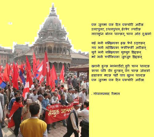 आज क्रान्ति छ ! ए नेपाली हो खै के भनौं तिम्रो संयमता, धैर्यता या कायरता सोच त कति सह्यौ, कति पिल्सियौ र कति छक्याइयौ अब त खुल्यो कि तिम्रो चेत? यी सामन्तहरुको नजरमा तिम्रो रगतको मुल्य कति रहेछ भन्ने कि अझै यिनिहरुकै क्षत्रछायाँमा तिम्रो "लोकतन्त्र" फष्टाउँछ भन्ने भ्रान्ति छ? हैन भने आफ्नै नयाँ नेपाल बनाउने हेतु आज क्रान्ति छ ! Neutral