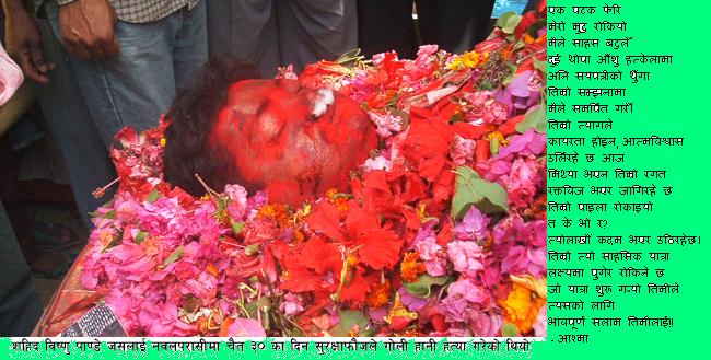 Loktantrik andolan ko lagi ragat bagaune, bir sahid haru ma mero bhab purna shradanjali... Des le ragat mage mero bali chadaunu rudinan meri ama U Nepali ko chori U Nepali ko chori ...