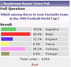 here is the poll from nepalnews. the poll was put just before the start of quarter finals. I dont see one semifinalist there. How can nepalnews be so dumb not putting that team in the post . may be thats the odd one out .does this insinuate something? Probably they are the one who are going to win the world cup.