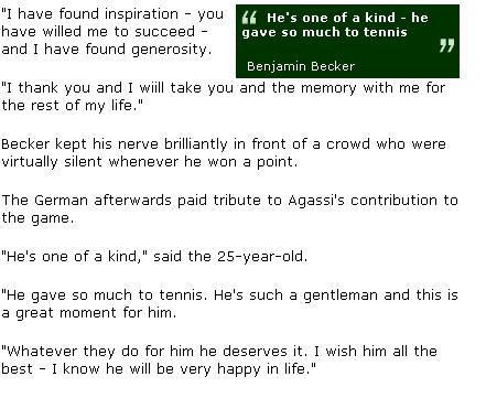 Indeed, Agassi is a role-model for us, a new generation. And I truly believe he has a true sportsmanship than many players so far. I agree with Loote that he is not a new breed of serve-and-volley players as Sampras or many of his generation, but sure he is one of the best baseline player so far. I had always admire his personality and game. I grew up watching him playing on clay,grass or hard-courts. What I was fascinated of him was his rebellious nature at the beginning and his coolness in his later years.