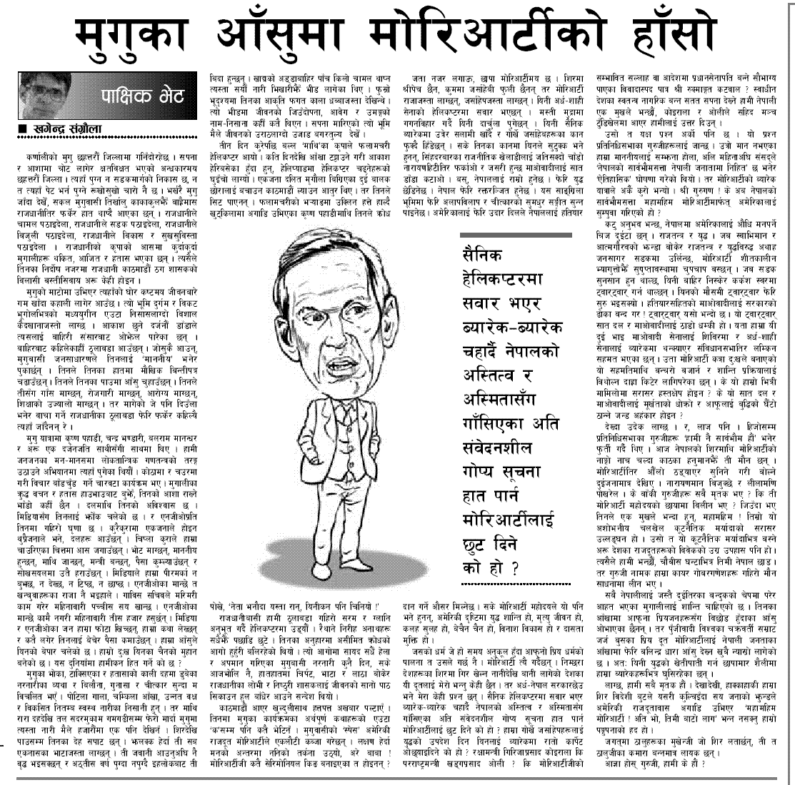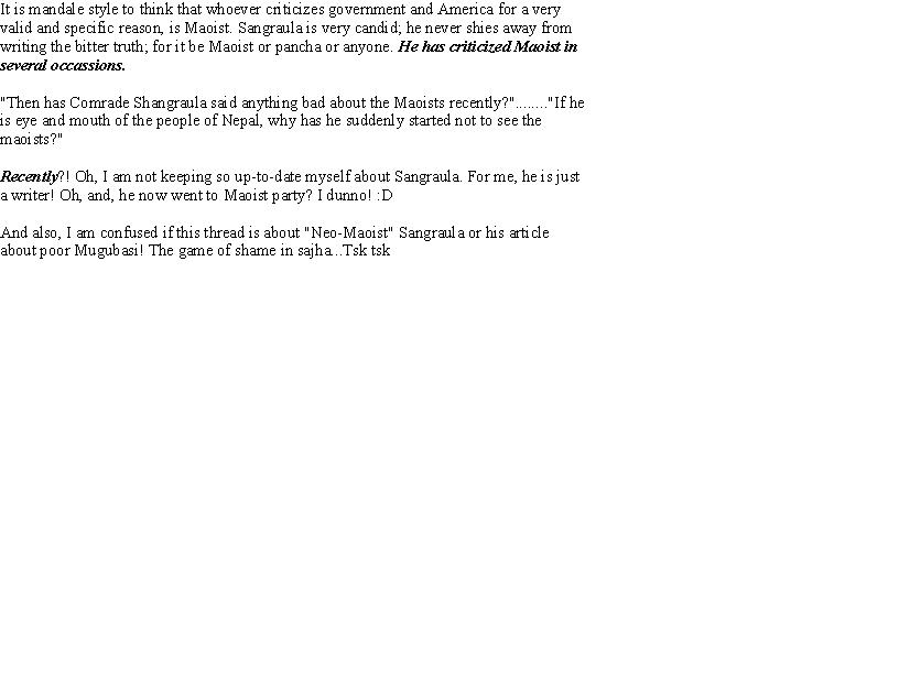 Again: That person who he told wanted to fly and didn't get to fly, could just be the personification of the way of life there, and Sangraula is not to be blamed for this. Blamed are to be those kayar gober ganesh netas. It is mandale style to think that whoever criticizes government and America for a very valid and specific reason, is Maoist. Sangraula is very candid; he never shies away from writing the bitter truth; for it be Maoist or pancha or anyone. He has criticized Maoist in several occassions. Yes, it is very wrong for foreign country's ambassador to fly in Nepal Army's helicopter and going to the barracks. Dead wrong we are if we keep pretending not to see that and blaming a writer who dares to write against big brother and kayar gober ganeshs.