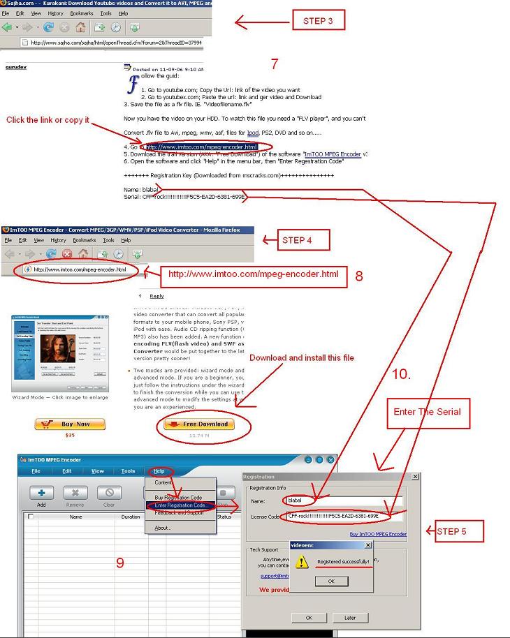 4. Go to http://www.imtoo.com/mpeg-encoder.html 5. Download the trail version (AKA: "Free Download") of the software "ImTOO MPEG Encoder v3.1 " and install the software. 6. Open the software and click "Help" in the menu bar, then "Enter Regestration Code"