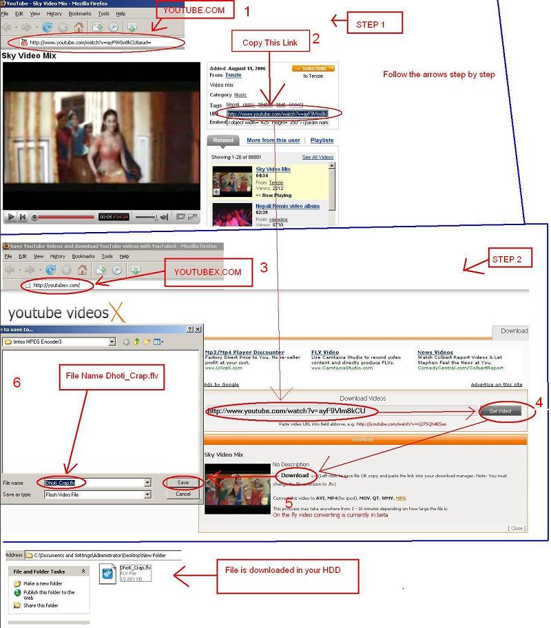 1. Go to youtube.com; Copy the Url: link of the video you want 2. Go to youtubex.com; Paste the url: link and ger video and Download 3. Save the file as a flv file. IE. "Videofilename.flv"