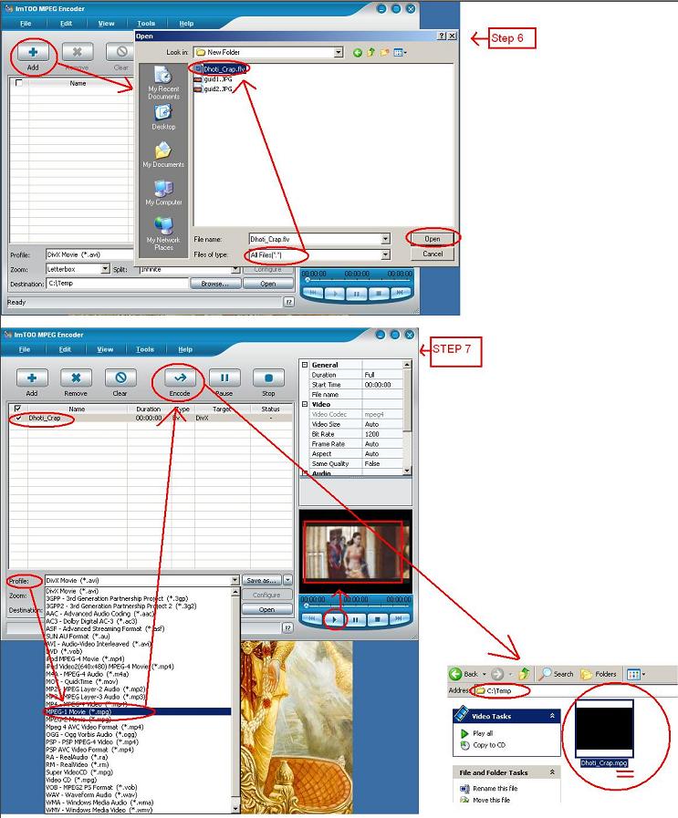 8. Click on the "+ (ADD)" botten and browse to the folder of the video you downloaded. 9. On the "files of type" to open choose "All Files *.*", and select your .flv file and open. 10. Click "Profile" Down on the bottom of the software, and choose your file format. 11. Press Encode, and wait till the file is completely encoded.