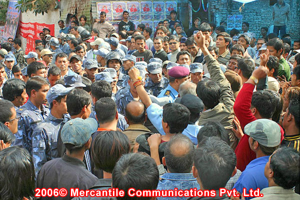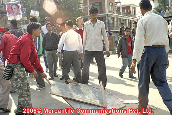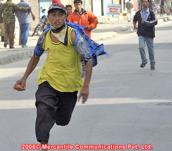 र New Version of मन्डलेहरु???? A Maoist cadre chasing local residents of Kupandol, Kathmandu, with bricks in his hand after the locals started protesting against the Maoist pressure to provide them food and shelter, on Wednesday, Nov 08, 06. nepalnews.com/ANA