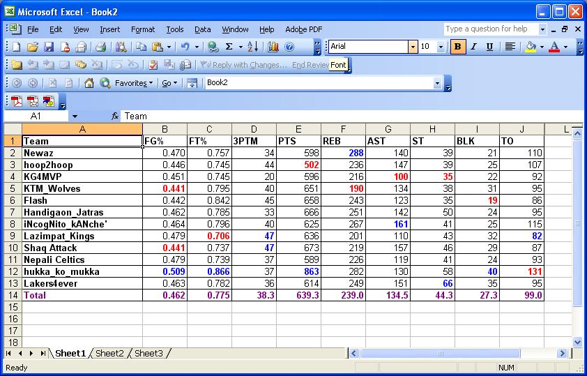 Oh... hey AX Cudos to you. I am at work and not allowed to open interent pages. I did anyways, just to put up the Spread Sheet but you already had it. So GOOD job. Hey, we went the whole season without talking about Baseball.. Quite a surprise. And I didn't see people talking much about DIV I football either. I have been busy not to dedicate time to post in here at all. I hope all is well here. Seems like Sajha is getting flooded with lot more JUNK threads in here. Now, someone might come kill me for this comment. Hukka had unbelievable numbers on FG%. FT% and PTS. Shaq is pretty formiddable. And yes AX bro you mentioned a good point there. As always, I do maths based on how many games did your players play in total. That's the underlooked stats. If someone has too many players starting one week... there's a good chance he will have lot many missing the following week. Anyways, let's keep the fun going. I will mail my GREENIES tomorrow. GO CELTICS. (PS: AX bro I forgot who you were in the league again!)