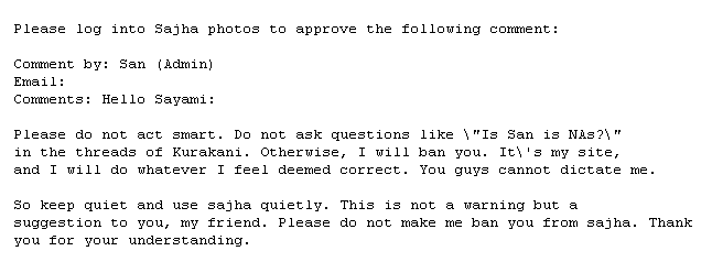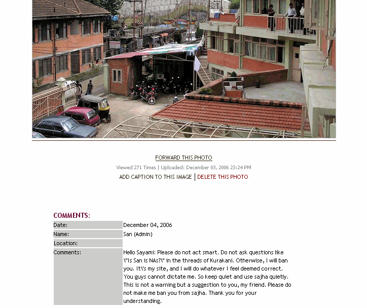 Comment by: San (Admin) Email: Comments: Hello Sayami: Please do not act smart. Do not ask questions like \"Is San is NAs?\" in the threads of Kurakani. Otherwise, I will ban you. It\'s my site, and I will do whatever I feel deemed correct. You guys cannot dictate me. So keep quiet and use sajha quietly. This is not a warning but a suggestion to you, my friend. Please do not make me ban you from sajha. Thank you for your understanding. I believe there are a lot of IT pros in running around. Why don't one of us put together another site for blogging so that people will have alternate option.