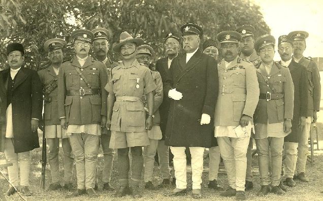 Those rulars drove Nepal into darkness for 200 years. from left: Mir Subba Gunja Man Singh, ?, Sur Shamsher, Col. Indra Bahadur, ?, Gajaraj Jung Thapa, Bada Kazi Marichi Man, Maharadschah Juddha Shumshere Rana (white gloves), Nayab Bada Guruju Hem Raj Pandey, Bahadur Shamsher, Surendra Shamsher, Rabi Shamsher, Narendra Man, ?, Postcard from about 1940