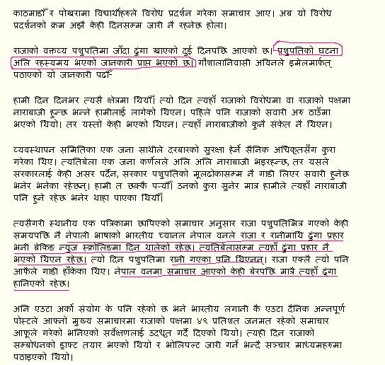 KP wrote in his blog: तित्राको मुख बैरी जङ्गलमा बस्ने तित्रो चराहरुमध्ये अत्यन्त सानो प्रजातिको चरा भएरपनि सिकारीको नजरमा चांडै पर्छ रे । उसको रङ्ग हरियो भएको कारण हत्तपत्त चरा ठम्याउनै गाह्रो हुन्छ । तर तित्रिक्क तित्रिक्क गरेर कराइरहने उसको बानीले सिकारीले फेला पारिहाल्छ । त्यसैले त भनिन्छ तित्राको मुखै बैरी । अहिलेको अवस्थामा हेर्ने हो भने नेपालको राजनीतिमा राजा ज्ञानेन्द्र यस्तै तित्रा भएका छन् । बदिलंदो राजनीतिक वातावरणमा उनको राजनीतिक उचाइ तित्रो भन्दा पनि सानो भइसकेको छ । चारैतिरवाट अधिकारविहिन बनेर नारायणशिटी भुत बंगलामा बसेका छन् । तर अझै आफ्ना गलत कामको पुष्टि गर्ने बहानामा तित्रिक्क तित्रिक्क गर्न भने छाडेका छैनन् । प्रजातन्त्र दिवसको उपयोग गर्न मनसायले राजाले दिएको अभिब्यक्ति त्यही तित्राको संकेत हो । कमसेकम अहिले अधिकारविहिन बनेका उनको चर्को आलोचना हुन छाडेको थियो । भए गणतन्त्रको कुरा हुन्थ्यो तर राजा ज्ञानेन्द्र यस्ता उस्ता भन्ने खालका राजनीतिक भाषण हराइनै सकेको थियो । तर प्रजातन्त्र दिवसका दिन आएको सन्देशले पुन आलोचना निम्त्याएको छ । अबका केही दिन राजा ज्ञानेन्द्र स्वतन्त्रताप्रेमिहरुको चर्को आलोचनाका पात्र बन्ने निश्चित छ र यसको शुरुवात पनि भइसकेको छ । माघ १९ को कदम किन चालिएको थियो त्यसको राजनीतिक पुष्टि भइसकेको छ । त्यो हो राजा सकि्रय हुने लालसाको परिमाण । जनचाहना के हो त्यसको पुष्टि १९ दिने जनआन्दोलनले पुष्टि गरिसकेको छ त्यो हो स्वतन्त्रता । त्यसैले अहिले आएर माघ १९ जनताको चाहना बमोजीम भनेर टिप्पणि गर्नु भनेको ज्ञानेन्द्रका जनता भनेका भरतकेशर िसंह सच्चितशमशेर राणा तु_िल्स गिरि लायतमा खेमा मात्र रहेछन् भन्ने बुझिन्छ । कारण यो त्यही झुण्डको चाहना थियो जसलाइ ज्ञानेन्द्रले पुरा गरेका थिए । त्यसैले राजाले भनेको यो जनचाहना एक राम्रो राजनीतिक जोक्स बन्न पुगेको छ । सायद पशुपतिको दर्शन गर्न जांदा खाएको ढुंगावाट रन्थनिएर जनतासंगको सम्बन्धमा सुधारको प्रयासका लागि प्रजातन्त्र दिवसमा सन्देश दिने आइडिया दरवारीयाहरुकै काम होला । तर विचरा उनीहरुले अहिलेको परिस्थिती बुझ्न सकेनन् । जसका कारण सम्बन्ध सुधारका लागि आएको सन्देशले थप राजनीतिक आशंमा मात्र थप गरेको छ । यसले बढ्दै गएको गणतान्त्रिक माहौललाइ नै सहयोग पुर् याउंछ नै । सन्देशले ज्ञानेन्द्रले अझै हिम्मत भने हारेका छैनन् है भन्ने चै देखाएको छ नै । तर त्यो प्रयास मृत्यु कुरिरहेको िसंह झै हो । जो भोकाएको छ तर आफ्नै अगाडि बसिरहेको मृग खान सक्दैन । यदी जनता नै सर्वेसर्वा हुन् भन्ने ज्ञानेन्द्रमा चेत पलाएको भए उनले असोज १८ २०६१ वाट बैशाख १० २०६३ सम्म गरेको कु कार्यप्रति जनता
