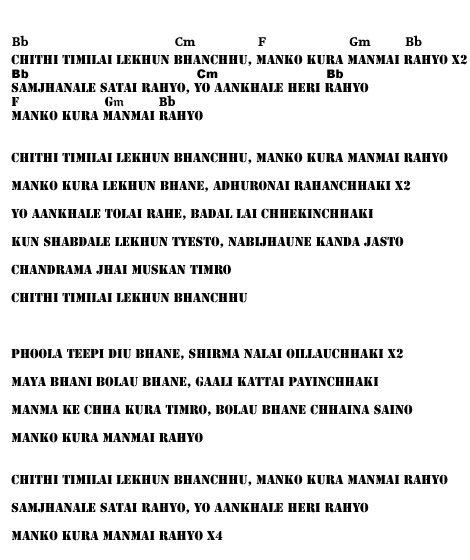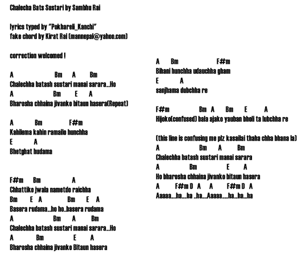 Please do remember that there maybe mistakes in the following chords of some of the songs I love so much, but I am an amateur guitarist and this is my own work. I get time only on weekends to play some guitar, upon which I listen to songs and plug the guitar chords out by myself on the best of my ability. Please request for chords of the songs, and with the help of some other Sajha guitarist, we can start a thread to benefit amateur guitarist like myself trying to take out chords of Nepali songs.