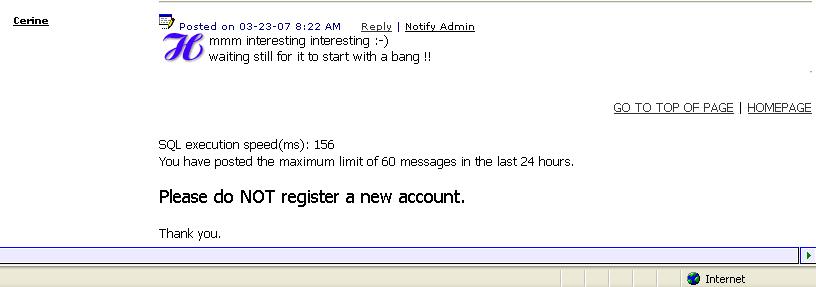 Hi Everybody!!!!!!!!!!!! how its going?? :-) I was not able to post with my previous name so have to changed it ;-P I din't know that we cannot post more that 60 times a day. damn....