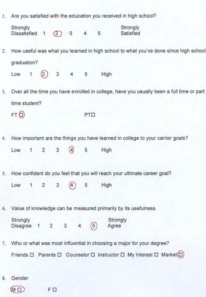 1 = 5 (No dobut on that) 2 = 3 (I just continue my further education and education i got from high school helped on that..that's it...nothing more) 3 = FT 4 = Low ( don't get surprised. Till my bachelor in nepal i never read before the one month of exam. I totally depend on that one month only..Once appeared in the exam and forgot everything instantly. Only reading, didn't get anything. it may be my weakness or something i don't know... when i m here...it's worst. don't wanna know why ? Well,, my online classes're taken by some one else...every week....Live class...i m sleeping all the time...and even i wake up it's useless...coz teacher don't talk about any thing else except gossips....) 5 = 3 (It doesn't mean that i don't have confidence..i can speack in front of 10 million people without any fear...the thing is that i don't know my career goal....i don't know where i want to be.since survey data needs some input i m marking it as 3..other wise i am higly confidence) 6 = strongly agree...( u would never know anything untill u face it or u apply it once) 7 = My Interest 8 = Male