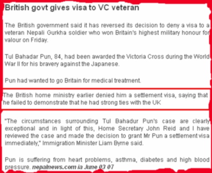"The circumstances surrounding Tul Bahadur Pun's case are clearly exceptional, and in the light of this the Home Secretary, John Reid, and I have reviewed the case and made the decision to grant Mr Pun a settlement visa immediately. This decision was not taken lightly and reflects the extraordinary nature of this case, in particular Mr Pun's heroic record in service of Britain which saw him awarded the Victoria Cross. It is entirely right that this record should not only be recognised but honoured. There has always been scope to grant settlement in the UK to ex-Gurkhas who have retired before July 1997, and who do not meet the requirements in the immigration rules. As on this occasion, discretion may be exercised on a case by case basis. We have also taken into consideration his current medical condition."