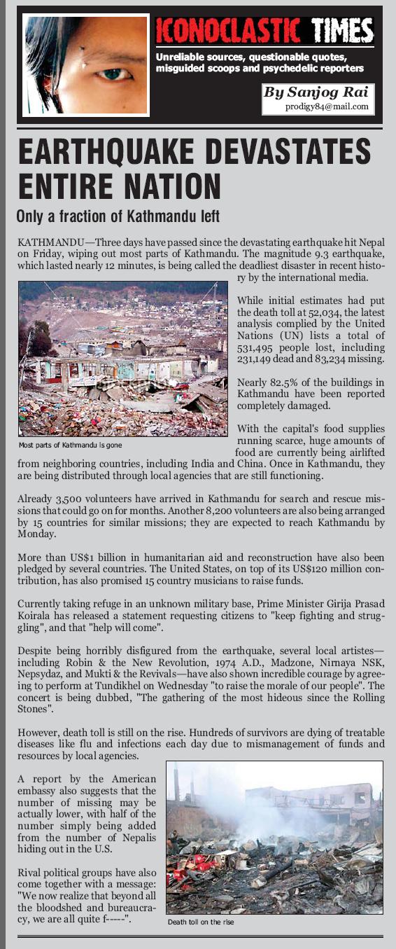 I saw one of this news about the earthquake in Nepal. None of the news agency has wrote about this except kantipuronline.com. I think somebody hacked kantipuronline because I do not think this is a real news!!!!!! EARTHQUAKE DEVASTATES ENTIRE NATION By Sanjog Rai Only a fraction of Kathmandu left KATHMANDU—Three days have passed since the devastating earthquake hit Nepal on Friday, wiping out most parts of Kathmandu. The magnitude 9.3 earthquake, which lasted nearly 12 minutes, is being called the deadliest disaster in recent history by the international media. While initial estimates had put the death toll at 52,034, the latest analysis complied by the United Nations (UN) lists a total of 531,495 people lost, including 231,149 dead and 83,234 missing. Nearly 82.5% of the buildings in Kathmandu have been reported completely damaged. With the capital's food supplies running scarce, huge amounts of food are currently being airlifted from neighboring countries, including India and China. Once in Kathmandu, they are being distributed through local agencies that are still functioning. Already 3,500 volunteers have arrived in Kathmandu for search and rescue missions that could go on for months. Another 8,200 volunteers are also being arranged by 15 countries for similar missions; they are expected to reach Kathmandu by Monday. More than US$1 billion in humanitarian aid and reconstruction have also been pledged by several countries. The United States, on top of its US$120 million contribution, has also promised 15 country musicians to raise funds. Currently taking refuge in an unknown military base, Prime Minister Girija Prasad Koirala has released a statement requesting citizens to "keep fighting and struggling", and that "help will come". Despite being horribly disfigured from the earthquake, several local artistes—including Robin & the New Revolution, 1974 A.D., Madzone, Nirnaya NSK, Nepsydaz, and Mukti & the Revivals—have also shown incredible courage by agreeing to perform at Tundikhel on Wednesday "to raise the morale of our people". The concert is being dubbed, "The gathering of the most hideous since the Rolling Stones". However, death toll is still on the rise. Hundreds of survivors are dying of treatable diseases like flu and infections each day due to mismanagement of funds and resources by local agencies. A report by the American embassy also suggests that the number of missing may be actually lower, with half of the number simply being added from the number of Nepalis hiding out in the U.S. Rival political groups have also come together with a message: "We now realize that beyond all the bloodshed and bureaucracy, we are all quite f-----". Posted on: 2007-06-24 21:50:10 (Server Time)