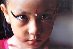 The main Kumari lives a sequestered life in a palatial temple in the capital, Katmandu. She has a few selected playmates and is allowed outside only a few times a year for festivals.