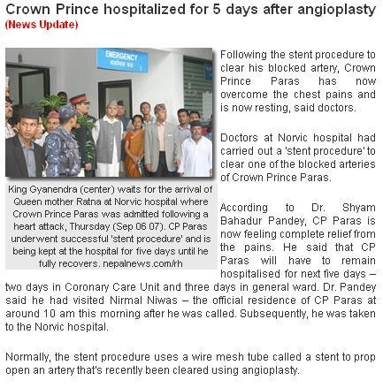Doctors perform angioplasty on Crown Prince Paras Kantipur Report KATHMANDU, Sept 6 - Doctors have performed angioplasty on Crown Prince Paras shortly after he was rushed to the Norvic - Escorts International Hospital at Thapathali in the capital late Thursday morning after he complained of chest pains. He was admitted to the hospital at around 11:30 am. Doctors attending him have said he suffered a mild heart attack. King Gyanendra and Queen Komal also reached the hospital to inquire about CP Paras' condition. He is being attended by a medical team led by consultant cardiologist Dr Bharat Rawat. According to a doctor of the hospital, CP Paras' lower artery was blocked leading to the "mild heart attack." "He will have to stay in the hospital under constant medical supervision for five days including two days in the Intensive Care Unit," sources said. Doctors attending him have also diagnosed him with high cholesterol, and moderately high blood pressure. Norvic Hospital physician Dr Shyam Bahadur Pandey and Dr Kishore Rana had decided shift Prince Paras to the Norvic Hospital after they were called to Prince Paras's residence at the Nirmal Niwas as he complained of chest pains. At a press conference in the hospital today, Dr Pandey said that the Crown Prince is out of danger and will have to remain in hospital for five days including next two days in ICU. Dr Pandey added that he also diagnosed him with high cholosterol and moderately high blood pressure. "He will have to change his food habit and lifestyle to keep the blood pressure and cholesterol level normal," he added. Security has been tightened around the hospital. MY SANSAR.COM REPORT: