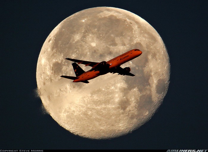 Now this is what i call photography, simply exquisite!! Astraeus, Boeing 757-23A. Taken at london. The Moon catching the first rays of the Sun.