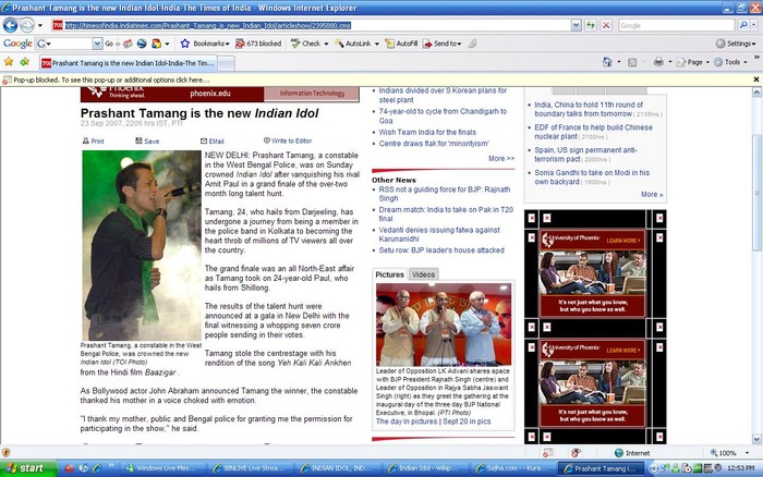 here is another link http://hindustantimes.com/StoryPage/StoryPage.aspx?id=2a5270ce-7961-4bf4-a79a-a6dcafe62685&&Headline=Prashant+Tamang+is+new+Indian+Idol WB Police constable Prashant Tamang is new Indian IdolAds By Google Airtel Calling Cards Get upto 35% Free Talktime and make calls at 5.9c to India! www.AirtelCallHome.c Press Trust Of India New Delhi, September 23, 2007 First Published: 22:38 IST(23/9/2007) Last Updated: 22:43 IST(23/9/2007) Print Email IM on Yahoo Add to Del.icio.us Prashant Tamang, a constable in the West Bengal Police, was on Sunday night crowned Indian Idol after vanquishing his rival Amit Paul in a grand finale of the over-two month long talent hunt. Tamang, 24, who hails from Darjeeling, has undergone a journey from being a member in the police band in Kolkata to becoming the heart throb of millions of TV viewers all over the country. The grand finale was an all North-East affair as Tamang took on 24-year-old Paul, who hails from Shillong. The results of the talent hunt were announced at a gala event in New Delhi with the final witnessing a whopping seven crore people sending in their votes. Tamang stole the centrestage with his rendition of the song Yeh Kali Kali Ankhen from the Hindi film Baazigar. As Bollywood actor John Abraham announced Tamang the winner, the constable thanked his mother in a voice choked with emotion. "I thank my mother, public and Bengal police for granting me the permission for participating in the show," he said.