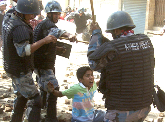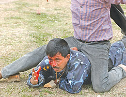 स्यान्कान्छा: क्याम्पसभित्र छिर्दो रेछ। बजाइदिन्छु यही इटाले, अनि खान्। लाहुरेदाइ: अय अय दुख्यो नि।(साले ज्ञाने पख! गणतन्त्रमात्र आओस् न मैले जान्या छु, तँलाई।) पछाडि बिर्खे: धुत् बढि गर्नु हुँदैन स्यान्कान्छा। (हात पछाडि तान्दै।) प्रहरी पनि हाम्रै दाजुभाइ हुन्। - http://www.hknepal.com/blog/?p=41