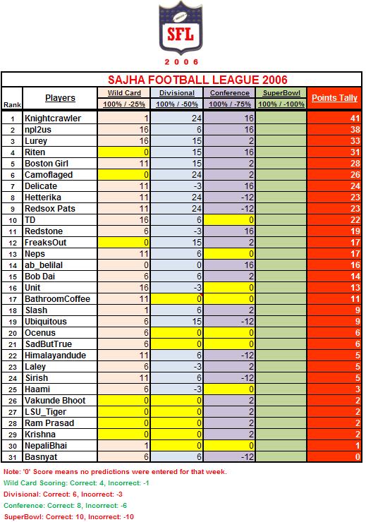 It feels really Good to be the KING......atleast for one week..... I feel for you, our very own Patriots' loyalists.....Sorry, but, you guys got Burnt by Colts, and Manning in particular yesterday !!!! Oh well, we got 2 more weeks to witness history in the Making.....Manning winning his first Superbowl Ever........ Now, back to being the KING......Oh yeah...pls look at the scoreboard....... Slash Bro, I gotta thank you for making me the SFL Commissioner ke.....and Delicate Bro, for interjecting the idea of the point system..... Bob-Dai....I hear you brother.....We sure have few things in common, a la the Colts....and the Lakers....and......