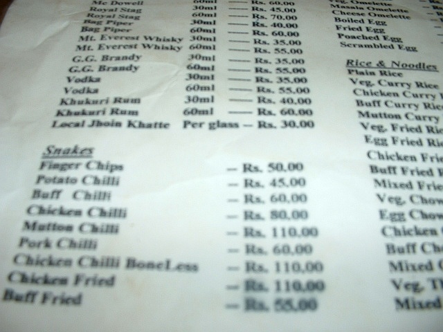 Ho ni Nepalean Rautuaa khana gaako ta siddisakechha :-( Aba Maasu Polera khanu parla... he he BTW: how u type in nepali..hmmm Here is Menu from nagarkot, notice the spelling... SNAKES instead of snacks... LOL