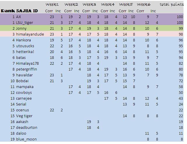 Yet another Crazy week for college football. Here are the results for this week. AX is still on the top but I got tied with him. Looks like I am coming back to the prediction game like tigers rolled in the 4th quarter against the gators. oh my lord, last night went crazy with that win. 5 fourth down conversions and the challenge call by miles for 7 yards was impressive. Also happy for Tennessee win and how about USC (:  ) What happened to them???. I just want to hear the reactions from those ESPN analysts talking USC should have been #1 team last week.