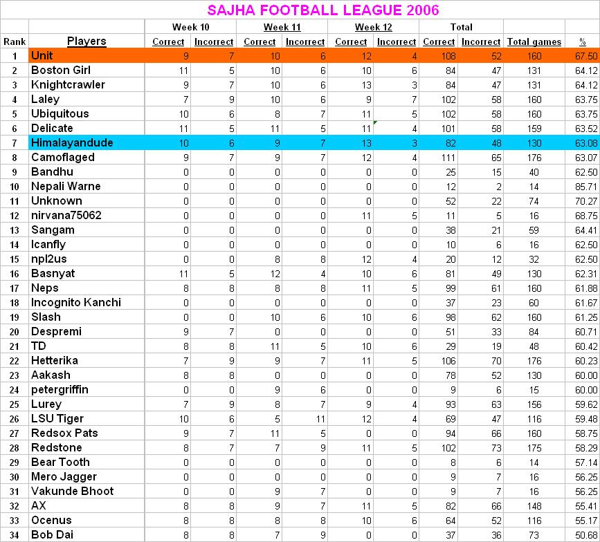Sadly college football reg season is over. no offense to Auburn and SEC fans, teams from Pac 10 and Big 12 are the top 2 teams. I believe Auburn started the season ranked no 17(???) whereas USC and OK were no 1 and 2(???) so there is no way Auburn Tigers were going to go ahead those teams if they were to be unbeaten. I know BCS is not the perfect system but you gotta play with the hands you are dealt with. I hope to see more tweak int he BCS system so it becomes the best. I would rather have love to see Auburn playing wither Texas or Cal, which are the best teams with 1 loss.... as CW said, if Auburn needs to have any chance for title share, they have to thrash 10-2 VaTech. I am so surprised to see Ex Huskers Coach Frank Solich has not been mentioned for any vacant coaching job around the nation. He is a great coach and had a winning percentage of about .750 while with Huskers for 6 years... He is best suited for Penn State job, if Jo Pa were to retired now. It was a thriller last nite.... Vinny is giving his best?.. how about the TUNA, he is for real. it's nice to see those NFL pundits praising TUNA again. Didn't they think TUNA was making mistake for not starting Drew Hanson??? What you say now Mr. Salisbury and Cowboys great Troy Aikman. I hope last nite performance will keep Jerry ?Over Janney? Jones mouth shut. week 13 results.......
