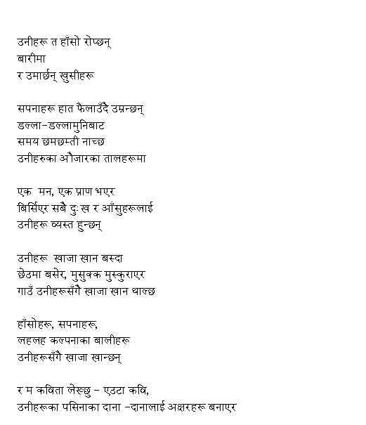 माने = मनेपालीकेतो लु हेर हाम्रो मास्टरनी दिदी को फोटो तासेको । मास्टरनी दिदी स्कुल मा बिरामी छ आउन सक्दिन बनेर आफ्नो खेता साथि हरु बतुलि काम् गर्दै रैच। मस्तेर्नि दिदि त येस्तो अनि हामि कस्तो हुनु त। चोर् त पकदिएछ। अनि भाउते ले कुत्त्ने हुरु लै फैल् पर्दिने रे। मैले त कुत्तिन। खै कस्ले कस्ले कुत्तेका हुन आफु त आखा चिम्लिदै बसेको थिये। मस्तेर्नि दिदि मलै चै फैल् नपर्दिनुस् है पिलिज्। माने तिम्रो कबित धतै रम्रो लग्यो। फेरि फेरि येस्तै कबित फुरदै गर्नु। Roll# 6 thuli hajir miss