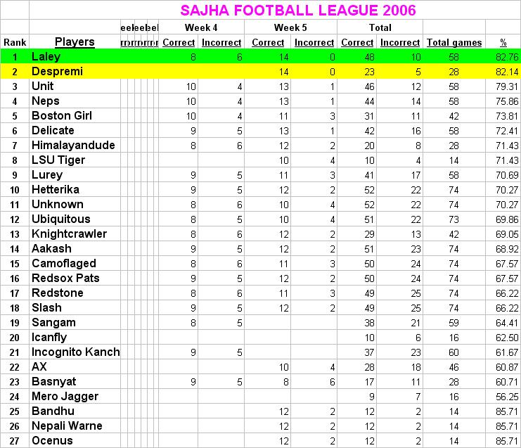 Slash bro, its just the human nature that you don't get satisfied for what you have!!!! am i right??? :-) redstone bro, am I getting that really annoying to ya'll?? lol ... naa.. i'm just talking lound to encourage you folks...not out of jealousy... and have i started early ..maybe I could have even higher rating..who knows lol :-) just being optimistic... so just be glad that I started late..lol plus...hey..maybe...UNKNOWN has different personality and perspective in expressing his winning status than mine. So that does not mean that i have to act like UNKNOWN whenever i get 14-0 or 16-0. For god sake can I atleast enjoy my moment when i'm within the reach!!!! :-) and TO ALL SAJHA FOOTBALL LEAGUE FOLKS: can I PLEASE be refered as SAJHA FOOTBALL LEAGUE PUNDIT LALEY...instead of just LALEY!!!!!! :-) LOL MUCH APPRECIATED, SFL PUNDIT LALEY. wish you all good luxk for predictions for this weekend and mysefl to be the leader once again. :-)