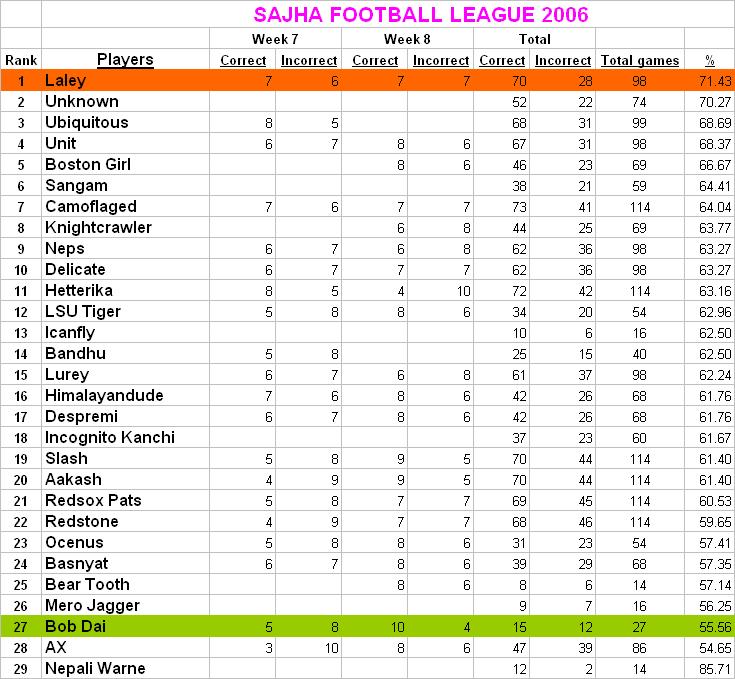 sorry about the confusion Turbine bro, I had problems getting to post on my computer. So, I emailed Rekha, and she posted for me. I will be really surprised to know if any Nepali Gal will have such detailed knowledge of American sports. I know bunch of Nepali sathi (ketis) who have some knowledge about their school teams and their rivals but not one with all around knowledge. But again, I am ready as always to be proved wrong. haha DWI, take it easy. And yeah, its quiet easy to get in Competition with just picking the picks. One can always listen to guys at vegas and get minimum of 10 correct picks each week. But I know none here does that. Just like myself many of you guys just guess. I know AX bro goes through the team's reports and few more. I try to pick few upsets all the time. But again, the favorites to win the game (by poll or by experts guess) wins most of the time. For an example: for week 9: atlanta, carolina, cincy, detroit, jacksonville, KC, SD, Tennessee, Chicaog NY (giants), Seattle, Pitts, Philly, Indianapolis wil be the VEgas picks. But I dont go with just the matchups,, I try to look at the guys who wil be missing, or the guys who are in good shape and etc.. its an intellgent guess rather than just a pick up guess. But again Football is an interesting game..... need I say more. to solve these Problems with ties. I will get a COnfidence Pool next year. I will explain how it works. But i will assure you guys, COnfidence pool will distinguish, the bling guessers from the intelligent guessers. haha, but again most of the folks here on Sajha are intelligent. In the same line, KuDoS to AX for getting the spreadsheets and heads Up to folks leading on the picks. as always jai Nepal go pats go proudNepali