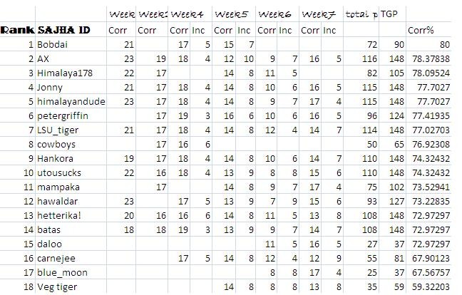 I totally unerstand jonny and mampaka bros' point. So next week on I will post both the total points and percentage. But ranking will be based on the total points. I guess that will be a fair game. :) Since we need some recognistion for those who plays every week and dont want any week off no matter what we got in the school , mid terms and stuffs or our fav team loses. We roll every week.