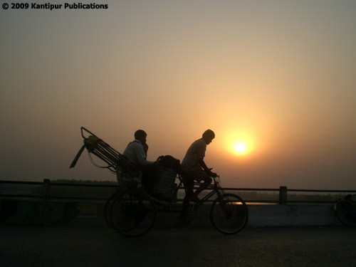Lau aayo pheri Chitwan ko samhjana ma A rickshaw-puller carts his passenger from Narayangarh in Chitwan to Gaindakot, over the Narayani Bridge against the setting sun.