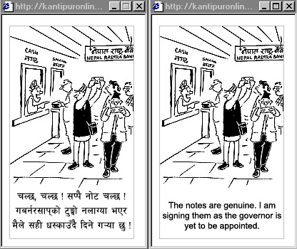 Prem Dai I have comments on the one you did not have. Funny ! The English translations somehow do not convey the strong meaning like nepali does. If Mr. KC himself, is doing the translations, he should seek for some one who is more proficient in English. If someone is doing Mr. KC translations, probably he should do it himself so that he can add feelings to his intelligent creations. For e.g. (BTW I am also not a proficient in English). The Original version in the last cartoon: "The notes are genuine. I am signing them as the governor is yet to be appointed." Structurally, I think, the sentence is not really flawed but does not convey the exact meaning (depending upon where you pause). A simple comma after "them" would have made it sound lot clearer. Why, in English version, have they failed to use some punctuation marks, like in Nepali? 1.The notes are genuine. I am signing them as the governor is yet to be appointed. (original). 2. The notes are genuine. I am signing them as the governor, is yet to be appointed. (pause after governor). 3. The notes are genuine. I am signing them , as the governor is yet to be appointed. (pause after "them") but what about this: "I have signed the notes (more appropriately "bills") to make them genuine , as the governor has NOT yet been appointed ." or "To make them genuine, I have signed the notes (more appropriately "bills") , as the governor has NOT yet been appointed." I am making it sound more negative because of the action of appointing governor could not take place and this event needs to be emphasized in the sentence. I never thought of this before Prem dai brought it up. By the way, I feel the cartoonists are one of the most intelligent and creative. Keep the good work Rajesh KC but do consider what the people have said here ...one of your fans.