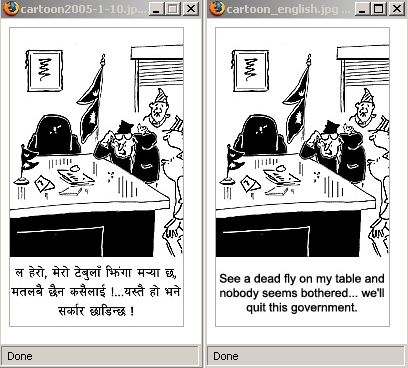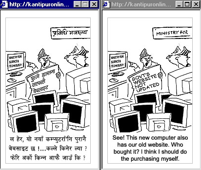 prem_dai, why are you being so fussy about these cartoons? If you want the exact word-to-word translation, the cartoon will be full of words.. and no place for the drawing. If that's what you want, then let me tell you that's not what most of the readers want. the primary focus should be how to convey the humor.. not the language.. regarding the grammatical mistakes in kantipuronline, I agree with you. I think you should write to them directly.