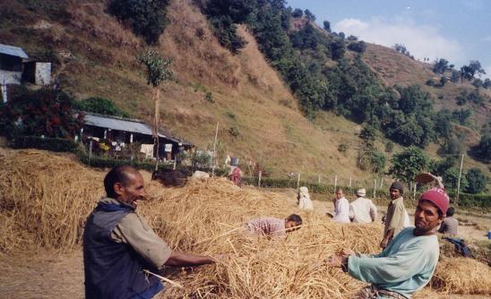 ल हेर सिरे र भउतेले पराल गुजुल्टो पार्दै अरेको । उता दादा, म, पुन्टे पराल छिरल्दै । अनि बेबि फ्याट गोरु धपाउदै (baby phat is making ox moving round on the straw )। फोटो राइट डाडाघर नमे