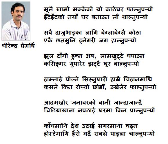 I heard Dhirendra Premarshi in one of the नागरिक सभा when I was at Kathmandu... Good writing indeed!!! touched my hear, and So energetic when he versed them in front of mass!!! सबले पाइला चालौँ साथीहरु एक न एक दिन अवश्य पुगिन्छ गन्तव्यमा!!!...:) अब भउते दाइको त के कुरा गरौं र, उहाँको कुरै बेग्लै!!...:) And My two cents: If u can't lead then follow, बेकाराँ यो त्यस्तो भो यो यस्तो भनेर के भन्छौ, सक्छ भने ल आफै निकालौ ल नेपाललाइ बचाउने उपाय!!! हाम्रो देशाँ अझ २ ४ दर्जनजना नयाँ पुस्ताका देश हाँक्ने भिजन भे'को नेता चाहिएको छ!!! सकिन्छ भने आफै निस्कौ लगाम थाम्न, सकिदैन भने त्यहि बुढाहरुको पछि लागम ,नभे चुप लागेर बसुम!!.....:) Nirman~*