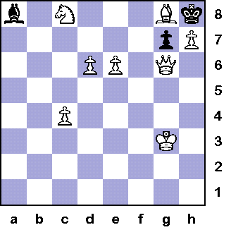 ` 1.White K e7 black ... 2. Q f7 black ... 3. K (x) g6
