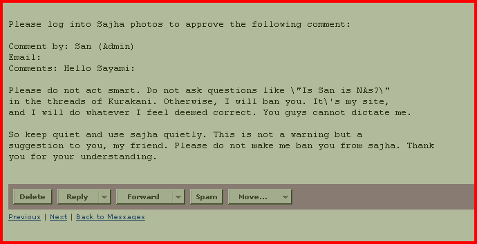 Sayami I can understand your frustration over this. Let me explain. Someone wrote a comment in your photos under my name. As you know, anyone can put comments on photos and use any name to put the comment under. The person who put that comment under my name is no other than Karma Rana (Check http://www.sajha.com/sajha/html/OpenThread.cfm?forum=2&ThreadID=38243#334699 ) Before you run into conclusion, do make sure that everything is kosher. If it is official sajha email, you will get an email from me directly and not as a comment to your photo or blog. Hope you understand this and I hope you understand the lameness of 'KarmaRana' who is trying to create a sense of disarray here in sajha. MAIN POINT: Do not take anything officially when someone sends you a message as comment to your photos or blogs. Someone can essentially put George Bush's name and put in comments. I hope you know better than to believe it!