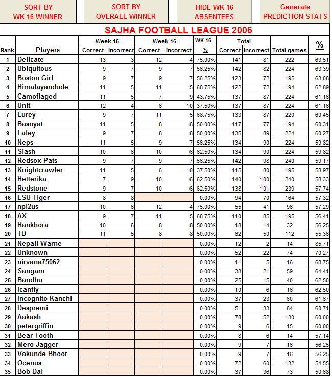 Thank you for the enlightenment Delicate Bro: I can almost see myself going 16-0 next week...wish me luck hai .... BTW, are you in fantasy leagues as well?