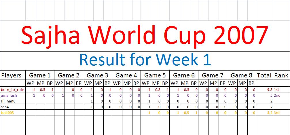 Result for WEEK 2 Game 1: Australia 358/5 (50 ov) Netherlands 129 (26.5 ov) Australia won by 229 runs Game 2: England 279/6 (50 ov) Canada 228/7 (50 ov) England won by 51 runs Today's result as expected...just that Canada fought back bravely to England than what most expected, despite their loss Heartfelt condolences to the legend Bob Woolmer..."gave his life to cricket and probably paid for it."