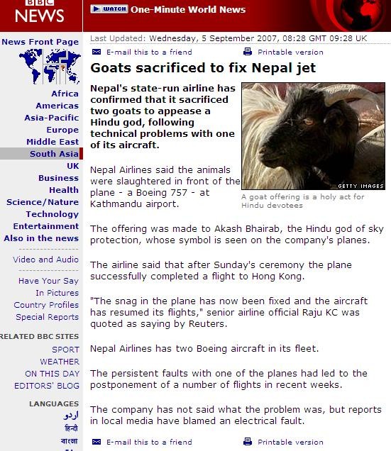 ACCORDING TO YAHOO NEWS Nepal airline sacrifices goats to appease sky god KATHMANDU (Reuters) - Officials at Nepal's state-run airline have sacrificed two goats to appease Akash Bhairab, the Hindu sky god, following technical problems with one of its Boeing 757 aircraft, the carrier said on Tuesday. Nepal Airlines, which has two Boeing aircraft, has had to suspend some services in recent weeks due the problem. The goats were sacrificed in front of the troublesome aircraft on Sunday at Nepal's only international airport in Kathmandu in accordance with Hindu traditions, an official said. "The snag in the plane has now been fixed and the aircraft has resumed its flights," said Raju K.C. (Eds: name correct), a senior airline official, without explaining what the problem had been. Local media last week blamed the company's woes on an electrical fault. The carrier runs international flights to five cities in Asia. It is common in Nepal to sacrifice animals like goats and buffaloes to appease different Hindu deities.