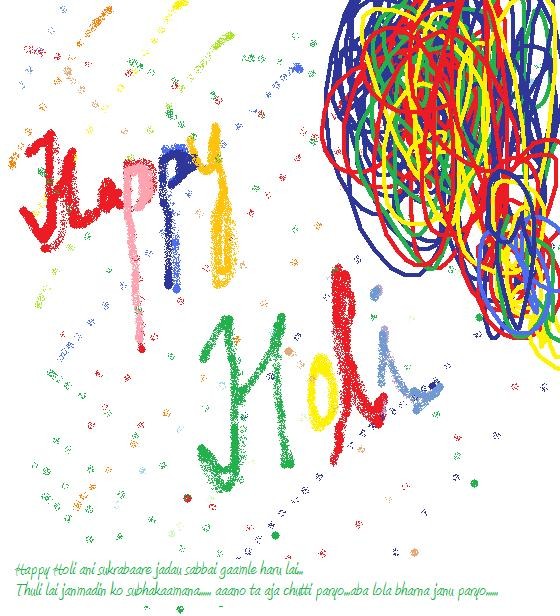 नमस्ते -जदौ, तारेमाम-सलाम सबैलाई ! होली को शुभकामना ! गूड् फ्राइडे को शुभकामना ! इस्टर को शुभकामना ! जन्म दिन को शुभकामना ! (ठुली लाई मात्र) ठुलि कती एउटा शुभकामना लिने हो ?होली को रङ जस्तै हामी सबै को जीवन रङिन होस् !
